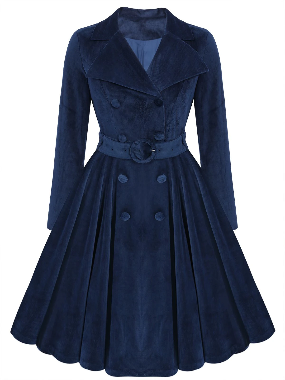This mid-length navy blue 1950s velvet long coat will definitely surprise you! The elegant and classic vintage coat is perfect for winter wear and can be worn for work, dates, and daily life. The label not only has a professional style of a suit but also reveals a high-end sense, increasing your graceful temperament. The corduroy fabric feels delicate, smooth, and skin-friendly, perfectly combining temperature and demeanor, making it comfortable, warm, and stylish to wear. This vintage coat has pockets on both sides and a detachable belt at the waist for easy cinching and a close-fitting waistline. The classic 1950s skirt-like hem fully demonstrates your feminine elegance and charm. Get ready to amaze everyone with this retro coat, you’ll have a gorgeous coat with a petal hem like a real 1950s lady!