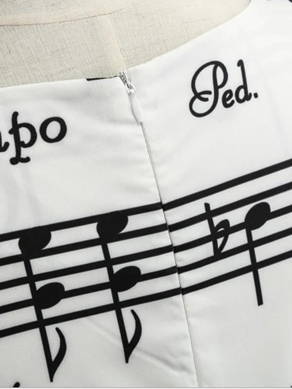 Raise your standards, dolls! The dress features a lovely music note print throughout a white backdrop cast in a marvelous stretchy fabric. This adorable dream is a retro-inspired swing dress in polyester complete in a gorgeous white with music note patterns throughout.